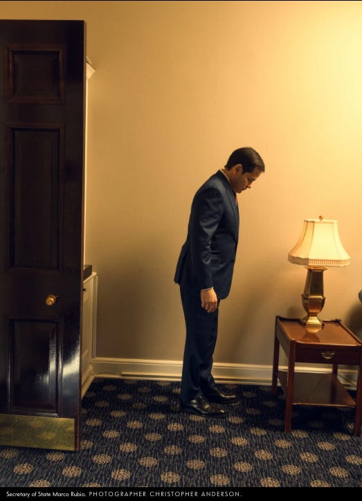To Chris Anderson’s credit, his approach does not differentiate between men and women as apparently happened at Newsweek nearly two decades ago. Instead, Anderson demonstrates that photography can still help us to comprehend others, even those with great power, as complex and vulnerable people rather than automatically deferring to them and celebrating their status, such as in the portrait of the group (above) and the Secretary of State, Marco Rubio (below), for whom the weight of the world seems that it may be too much to handle.